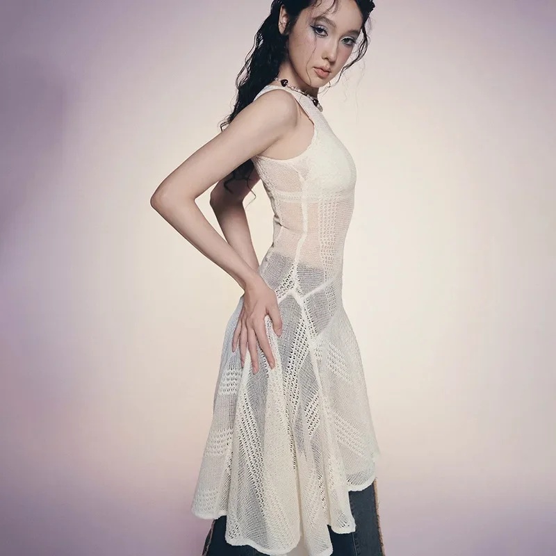 Solid Slim Dress for Women One-Piece See-Through White Dress Sexy Fashion Women Clothing O-Neck Sleeveless Y2K Ropa De Mujer